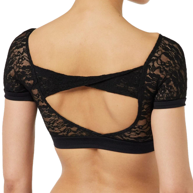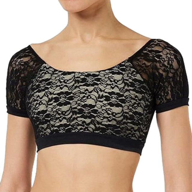 Crop top with stretch lace details in front and back. It has front lining support. Made with superior Tactel fabric for great flexibility and very soft feel.